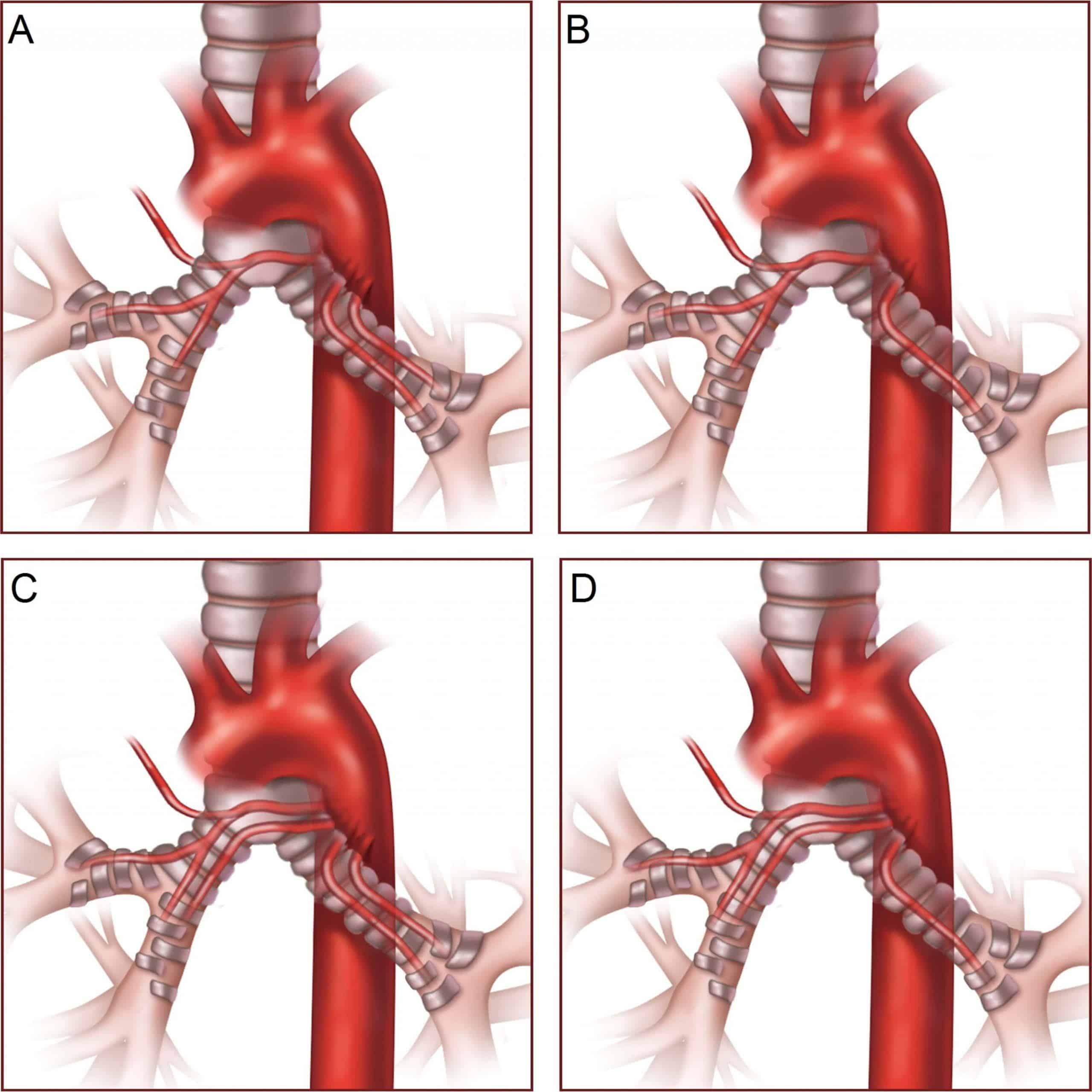 – Type 4 (3 nhánh: 1 thân chung động mạch phế quản – liên sườn phải & 1 động mạch phế quản phải + 1 động mạch phế quản trái.